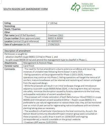 Forestry and Land Scotland (FLS) are managing this link - a chance for everyone to comment on their proposals for felling the remaining Production Forest plantation of Sitka Spruce in Balloch Wood.