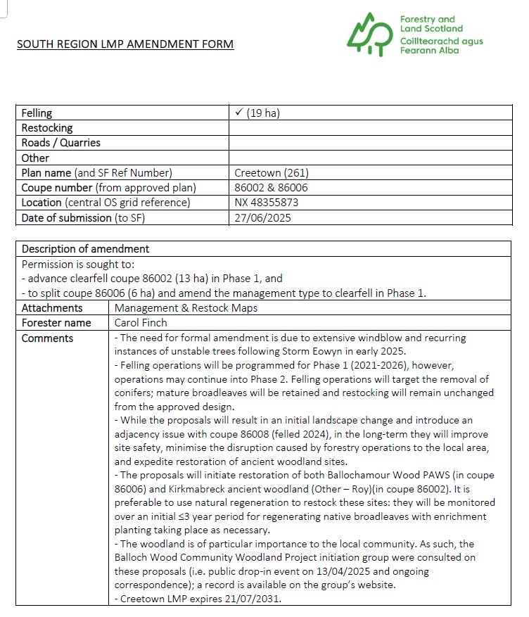 The official FLS reply, received on 13th October, notified us that the proposed "Felling Amendment" had progressed to the public register, with a link for comments.