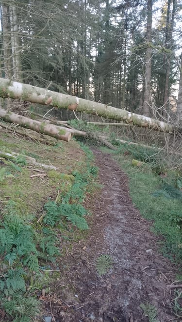 There are also some smaller broadleaf now down across the path in the felled area and at Cardoon Bridge.