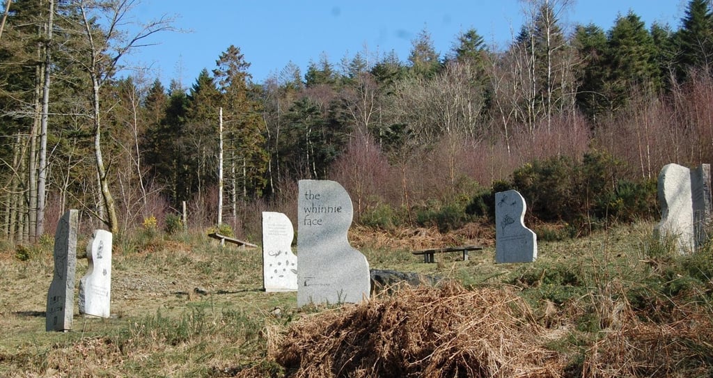 Each stone has been inscribed with haiku poems written by Creetown Primary school children, depicting their own responses to their woodland. The poems and iconography were blasted onto the surface of the stones by local companies Galloway Granite and Galloway Signs.
